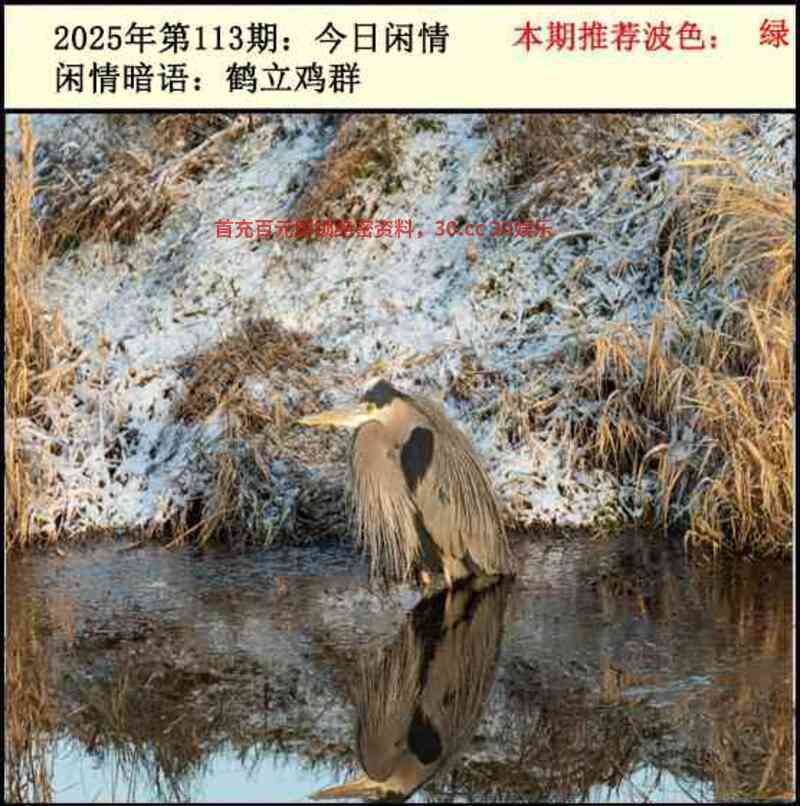 113期:今日闲情:鹤立鸡群:(推荐绿波) 解释:图是一只大鸟站在水中等待捕食鱼儿,看草地上面的寒霜应是冬季解冬肖-鼠猪牛,大鸟肉食动物又解肖-虎蛇龙狗。 解特肖:鼠猪牛虎蛇狗 |